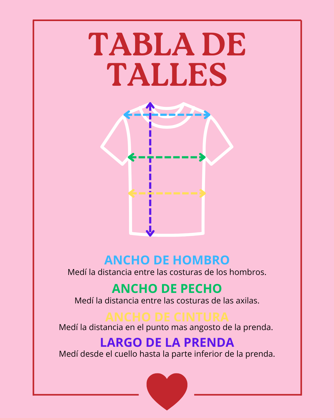 Talle M: Ancho de pecho 38cm, ancho de cintura 32cm, largo de la prenda 53cm.